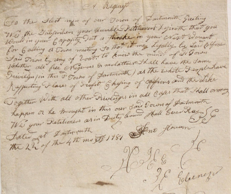 The second activity that he engaged in with his older brother, John, and other free mixed Native/African friends and neighbors, was to seek clarification of their rights as Free Persons of Color as to whether they could vote for their representatives and participate equally in their governance. Their efforts in this regard took place mainly in the years 1780-81 and included petitions to both the Massachusetts Legislature and Dartmouth Town Authorities.